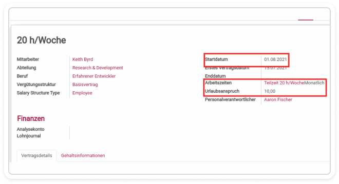 Beispiel: Ein Mitarbeiter wechselt im August in einen Teilzeitvertrag Vertrag das System berechnet den verbleibenden Urlaubsanspruch auf Grundlage der neuen Vertragsbedingungen neu.