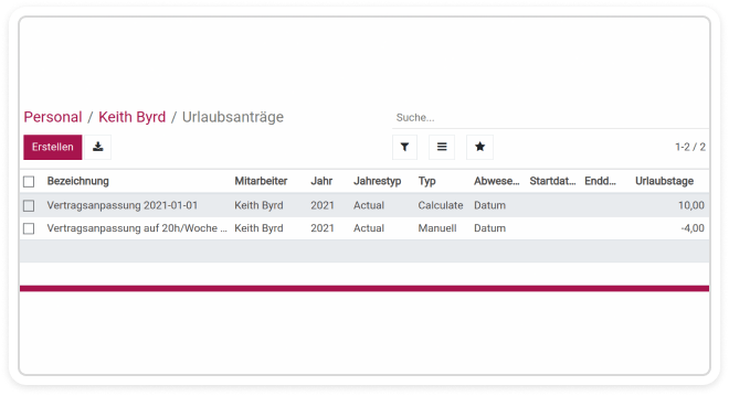 Beispiel: Ein Mitarbeiter wechselt im August in einen Teilzeitvertrag das System berechnet den verbleibenden Urlaubsanspruch auf Grundlage der neuen Vertragsbedingungen neu.