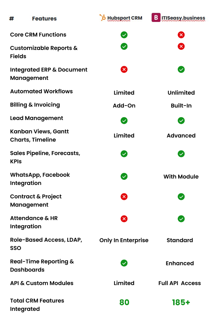 HubSpot CRM gives you basic CRM functionality at a premium price. ITISeasy.business delivers full-scale CRM + ERP at a fraction of the cost.