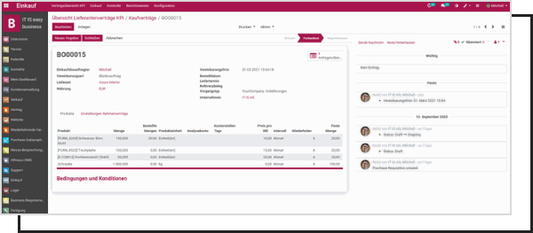 Effizient und präzise: ITISeasy.purchase agreement integriert sich nahtlos in Ihre Odoo-Umgebung. Ideal für Unternehmen, die mehr Kontrolle über Lieferantenverträge wollen – ganz ohne Tabellenkalkulationen oder externe Tools.