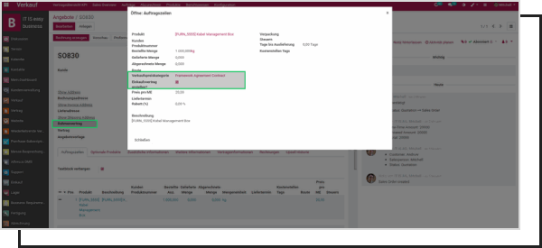 Erstellen Sie automatisch einen Lieferantenvertrag, sobald ein Verkaufsauftrag bestätigt wird – auch für einzelne Produkte. Kein mühsames Nacharbeiten mehr. Ihr ERP-Beschaffungsmodul bleibt mit Ihrem Vertrieb synchron.
