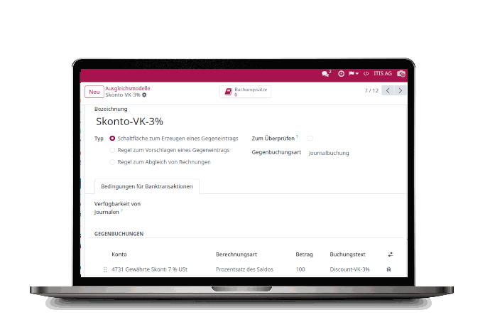 Im Rahmen der verfügbaren Abgleichsmodelle können Sie wiederkehrende Buchungen und häufig relevante Gegenkonten, wie z.B. für Skonti hinterlegen und so per Klick den Buchungssatz vervollständigen.