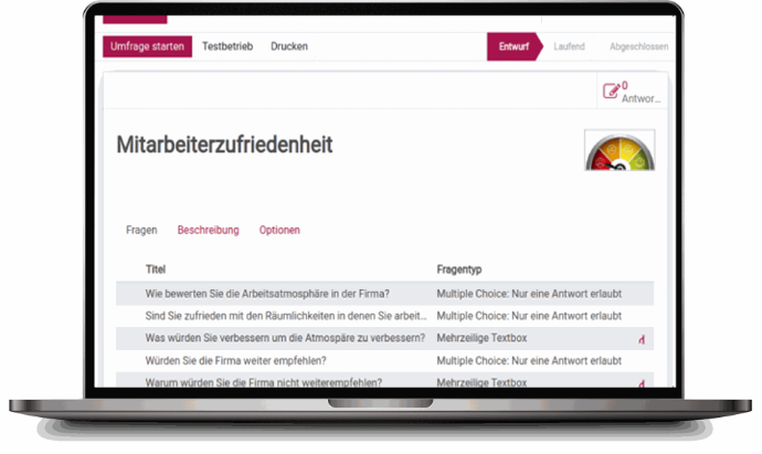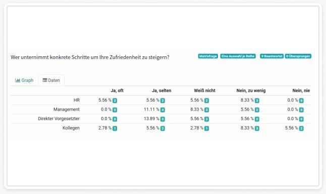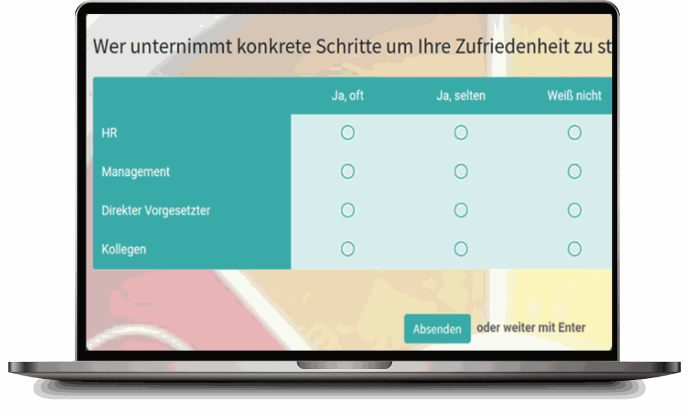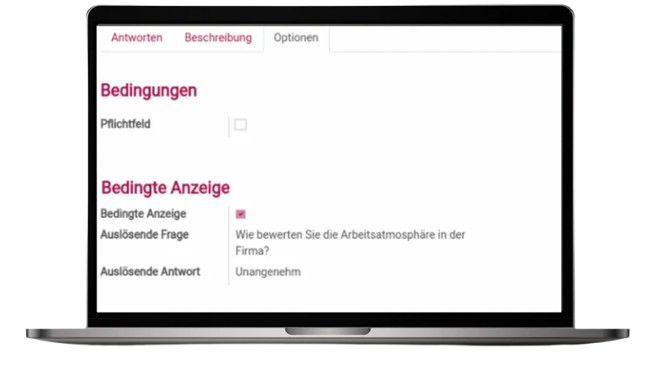 If the question “How do you rate the work atmosphere?” is answered with “Unpleasant”, additional follow-up questions are triggered automatically.